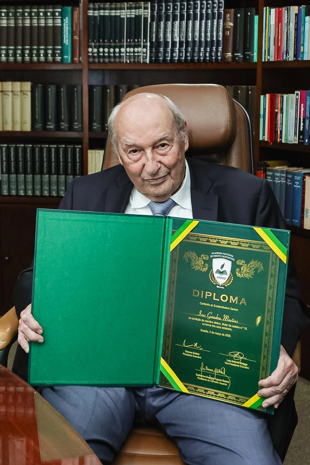 A Academia Nacional de Direito Desportivo - ANDD, na sede do instituto Ives Gandra Martins, localizado em São Paulo/SP, em 06/03/2026, deu posse ao Excelentíssimo Doutor Ives Gandra Martins, como membro da ANDD, que ocupará a Cadeira nº 19, que foi ocupada por Álvaro Melo Filho (in memoriam).